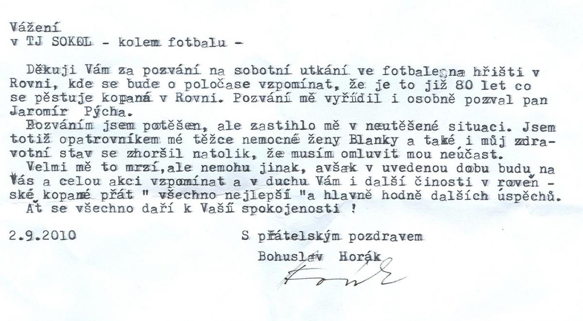 Závěrem bych ještě rád dodal, že T. J. Sokol Roveň vydal publikaci k tomuto výročí, která mapuje dějiny kopané v naší obci. Publikaci je možné zakoupit za cenu 99,00 Kč na obecním úřadě, v obchodě p. Miloše Plecháčka a při mistrovských utkáních na hřišti.