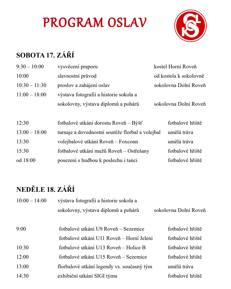 TJ Sokol Roveň slaví 100 let od svého založení. Sokolovna byla postavena před 90 lety. Významné důvody pro uspořádání víkendových oslav (17. - 18. září 2022). Fotogalerie: Přidat komentář Vaše jméno Comment * Formátovací možnosti Filtered HTMLWeb page addresses and email addresses turn into links automatically, unless the parent tag has the 'nolink' class.Řádky a odstavce se zalomí automaticky. Zrušit Leave this field blank